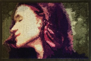 Ullgarnet har jag färgat själv. Jag har använt mig av ett femtiotal tussblandningar av de olika garnerna och färgerna. På varje nockrad har jag bytt tussblandning ett flertal gånger – upp till tjugofem gånger på en rad. I bakgrunden valde jag att enbart använda Åsboryagarnet som är matt och löst spunnet vilket ger ett suddigt uttryck. Jag har efter hand blandat i det tunnare Bragegarnet och stegrat andelen lingarn mot det parti som jag vill ska dra åskådarens främsta fokus till sig – ansiktet. Lingarnet är tunt och har hög glans vilket innebär att det ”glittrar” mer än ullgarnet och även ger en småprickighet som bidrar till en högre distinkthet.