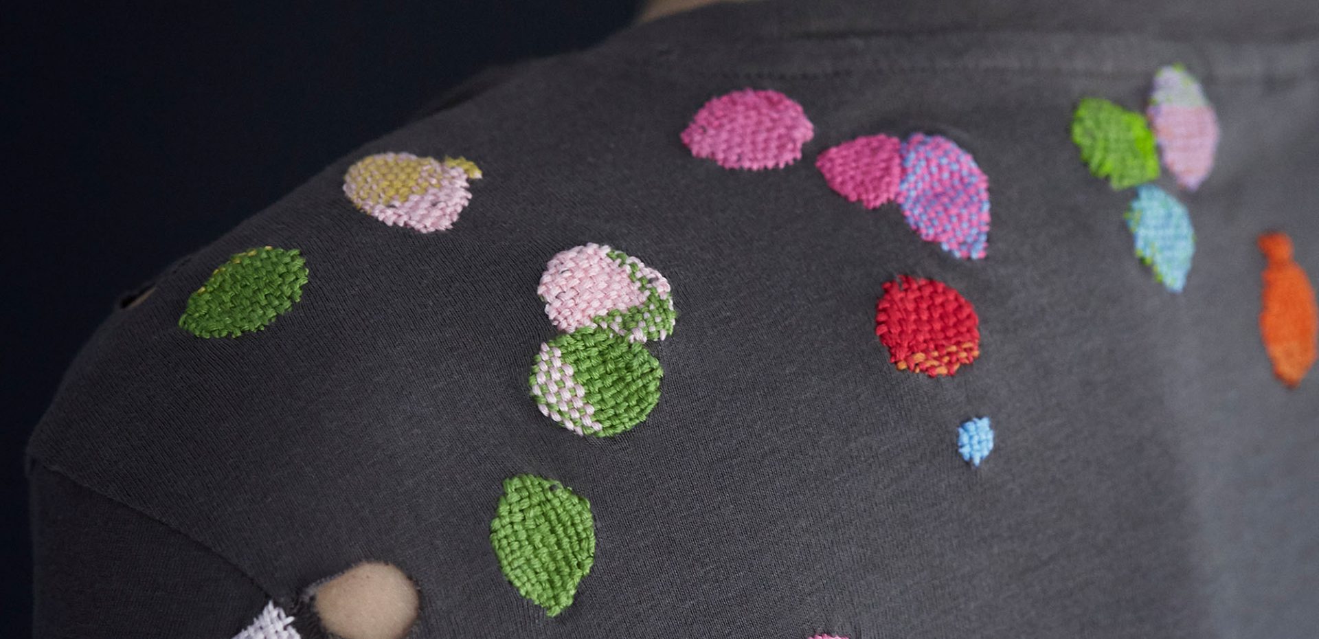 T-shirtens hål är stoppade med ett 6-trådigt moulinégarn som är relativt tjockt i förhållande till det tunna tyget. Effekten blir att stoppningarna bullar upp på sig den chokladbruna ytan som om den vore strösslad med Non Stop.