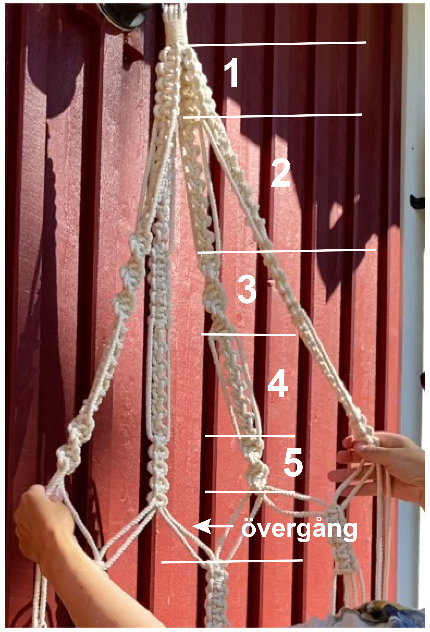 Här är knutarna som använts för att göra den här blomampeln. Man säger att man ”slår” en makraméknut och de rep man gör själva knuten av kallas knyttrådar medans repen som man knyter runt kallas kalvar.