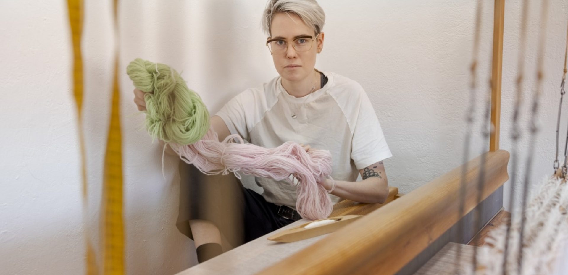 Hemslöjdens Ingeborg Strömberg-stipendiat 2022: Morris Åkermalm vid vävstolen. Foto: Mikael M Johansson, Kyrkans Tidning.