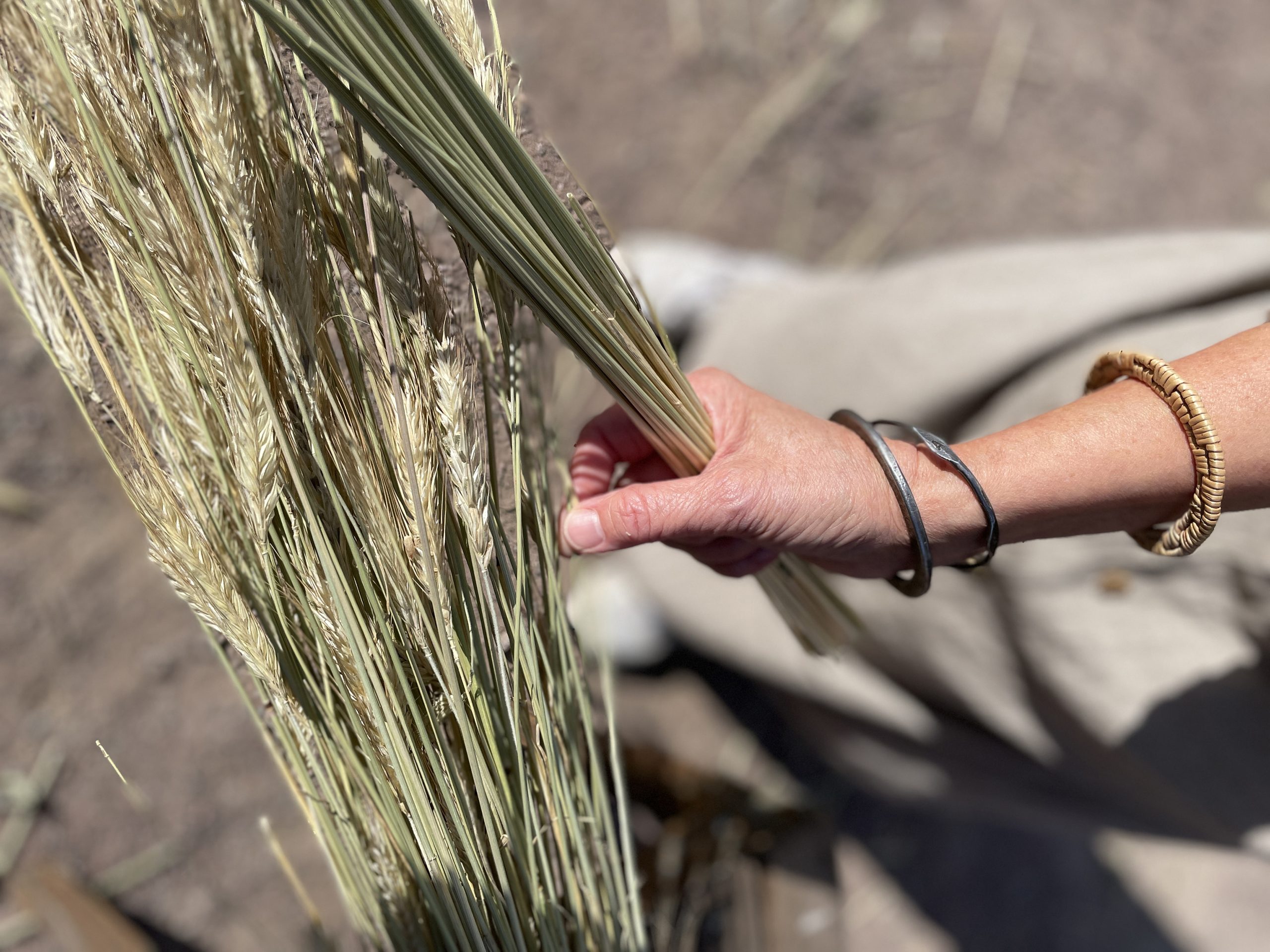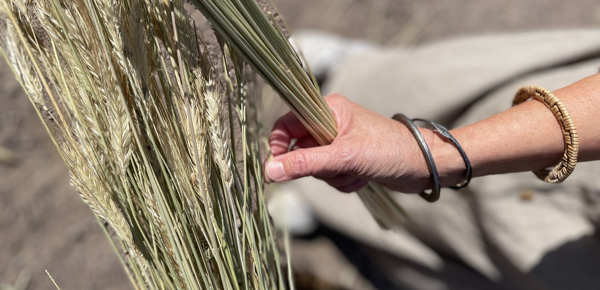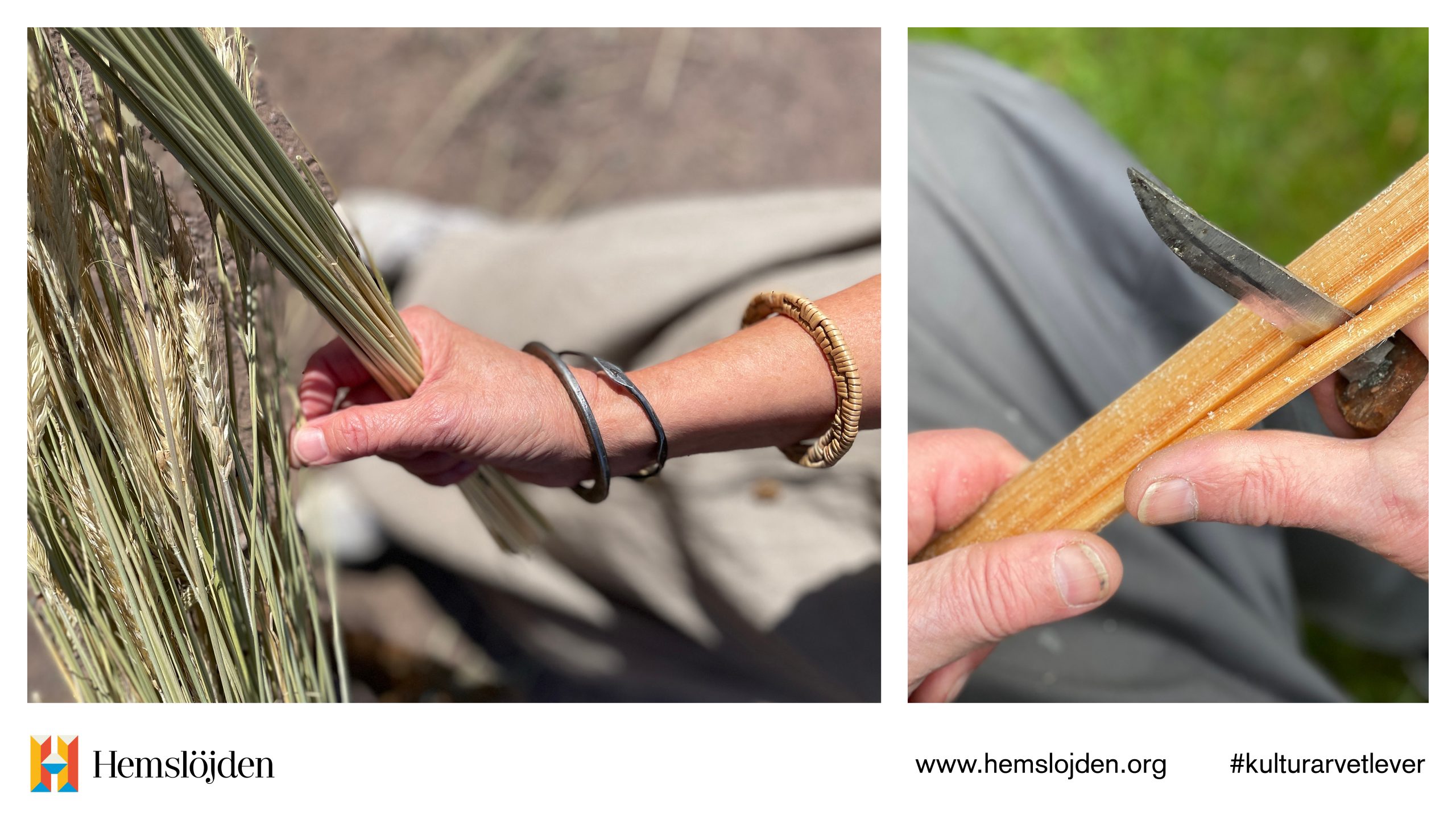 Vänster: Rensning och sortering av råghalm för att fläta en halmhatt. Höger: Klyvning av furu långs årsringen för att ta fram material till en Hedaredskorg. Foto: Annika Holmdahl.