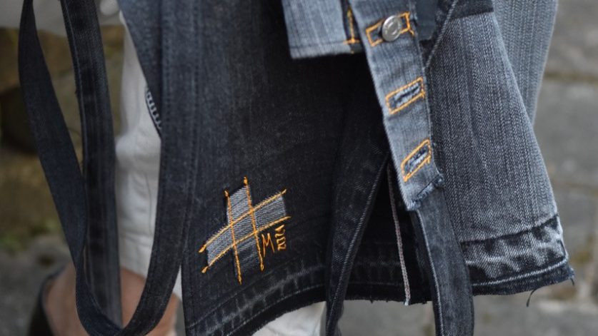 Förklädet sys ihop av olika tygbitar från jeans, canvas – och arbetsbyxor. Deltagarna skapar en egen personlig design utifrån detaljerna från sina byxor + läder- eller mockadetaljer och ev Sashiko/Boro-tekniker.