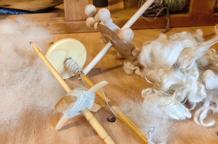 Vi har spinnverktyg och ull för att prova på.