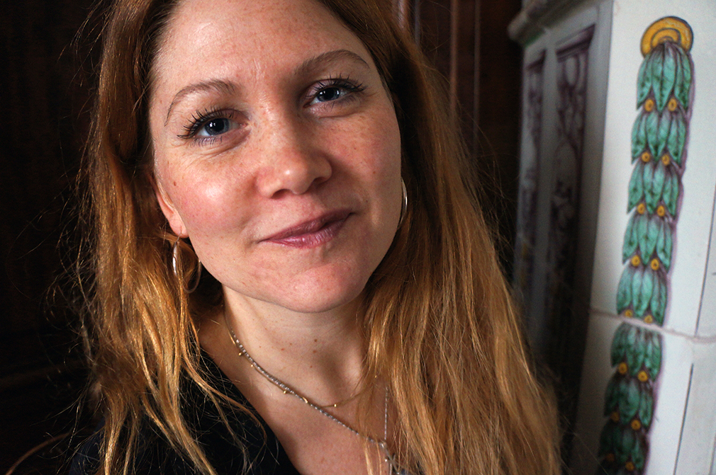 Sveriges första kvinnliga gesäll i kakelugnsmakaryrket, Emelie Jansson, framför kakelugn i Tottieska Malmgården på Skansen. Foto: Edith Backlund, Hemslöjden