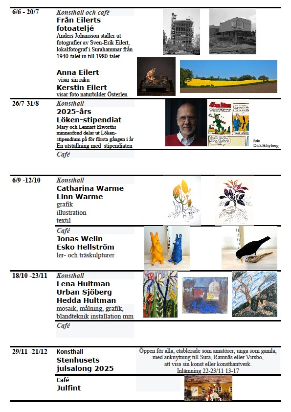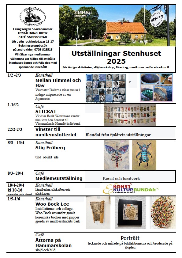 Tillsammans håller vi 40-talet medlemmar detta gamla stenhus, byggd 1847 till sex smedfamiljer, levande med verksamhet och VÄLKOMNAR just DIG till STENHUSETs aktiviteter. ”Den lilla kulturföreningen med de kreativa musklerna – Surahammars konst- och hantverksgille” som bildades 15 juni 1984 och firade 40 år 2024.Vi hoppas på ett givande konst- och hantverksår 2025.