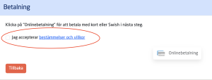 För att du ska kunna gå vidare till onlinebetalning behöver du först acceptera bestämmelser och villkor. För att läsa texten trycker du på den understrukna blå texten. När du kryssat i rutan för godkännande tänds symbolen för onlinebetalning upp och du kan nu gå vidare.