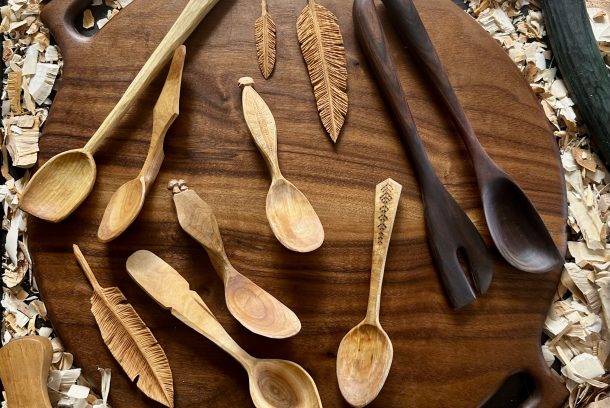 Av färskt virke täljer du en sked. Du får lära dig steg för steg. Från vilket träslag som...
